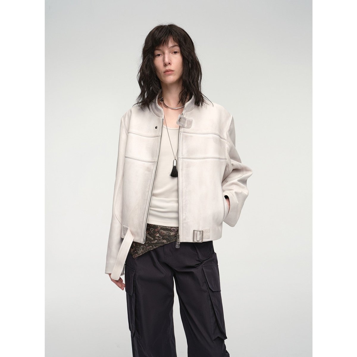 Retro Sheepskin Stand Collar Short Motorcycle Jacket “Caramel Mountain”