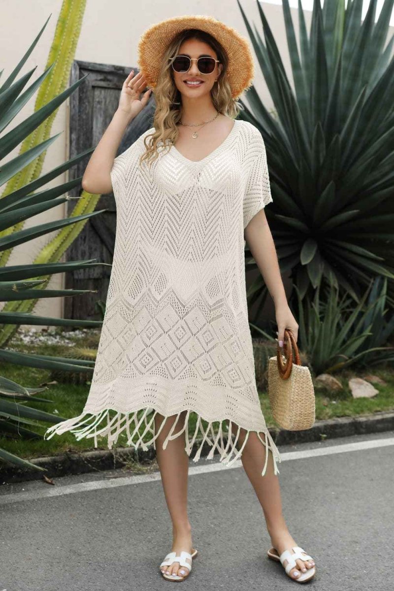 The delicate openwork design adds texture and visual interest, while the playful fringe hem introduces movement and fun to your outfit. This Fringe Hem Knit Dress is ideal for adding a subtle bohemian vibe to your summer looks, whether worn alone or layered with light accessories.