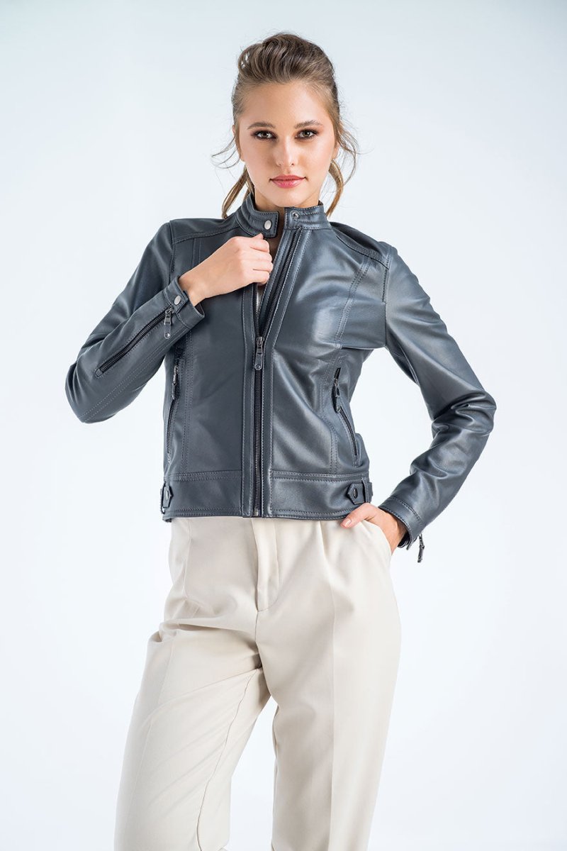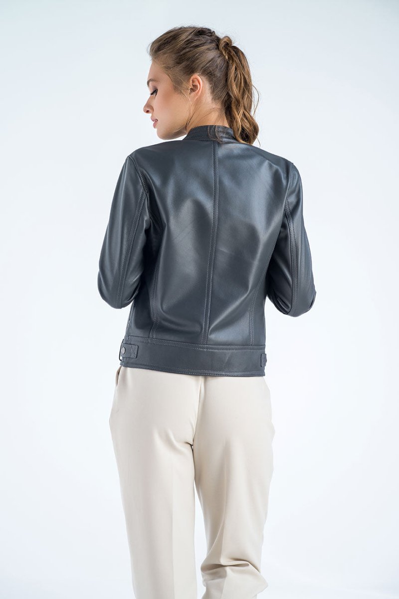 This gray leather jacket features a flattering cropped silhouette that accentuates your waistline and pairs beautifully with high-waisted jeans or skirts. The soft, supple leather feels luxurious against your skin, while the classic gray color adds a sophisticated touch to any look. Whether you're heading to brunch with friends or a night out on the town, this jacket is sure to turn heads.