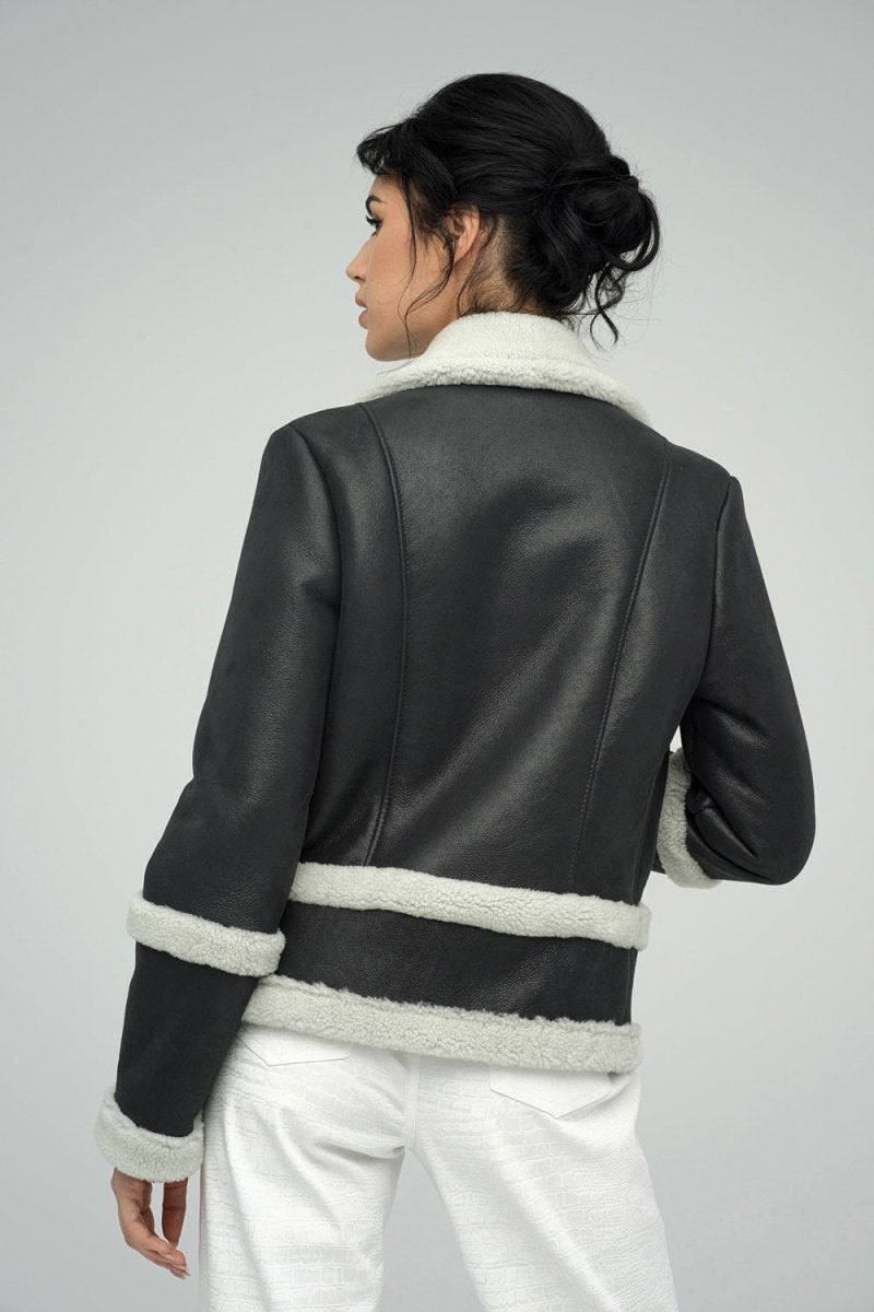 With its neutral gray color, this shearling jacket effortlessly complements any outfit, whether you're dressing up for a night out or going for a casual look. The timeless design ensures that this piece will never go out of style, making it a wardrobe staple that you'll reach for year after year.