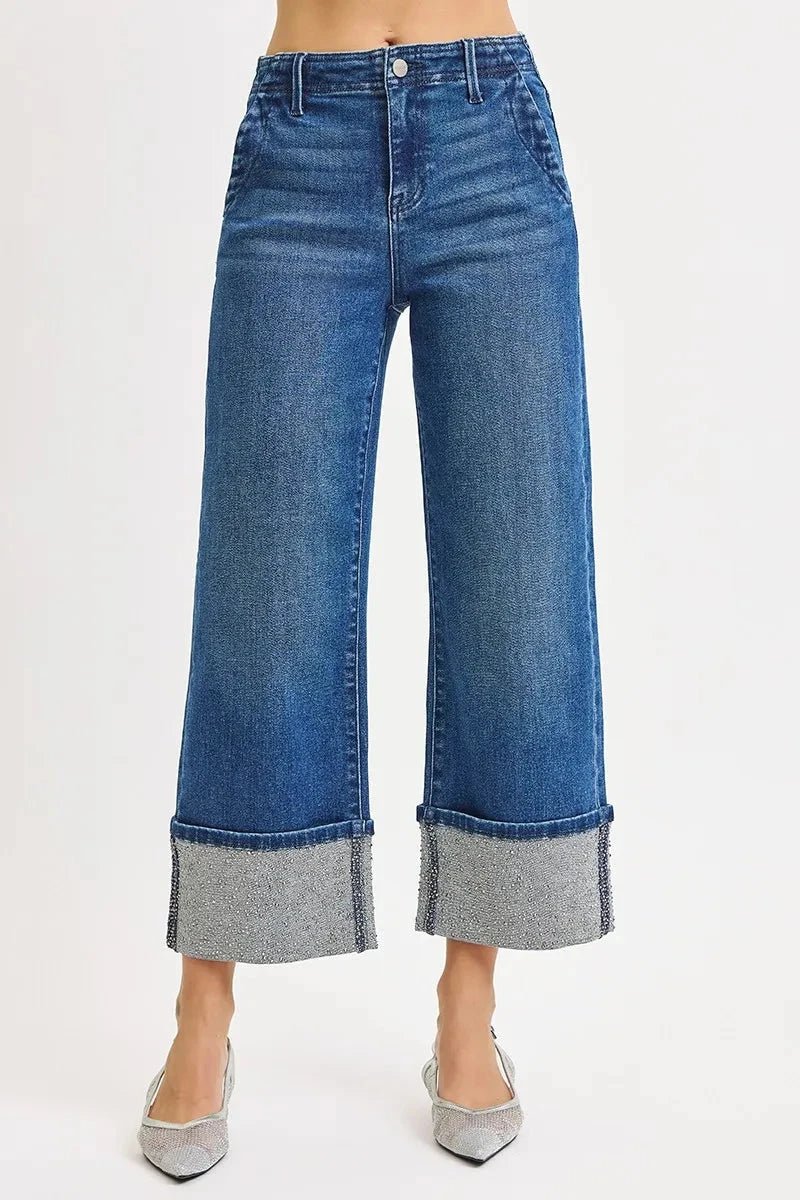 RISEN High Rise Ankle Wide Rhine Stone Cuffed Jeans