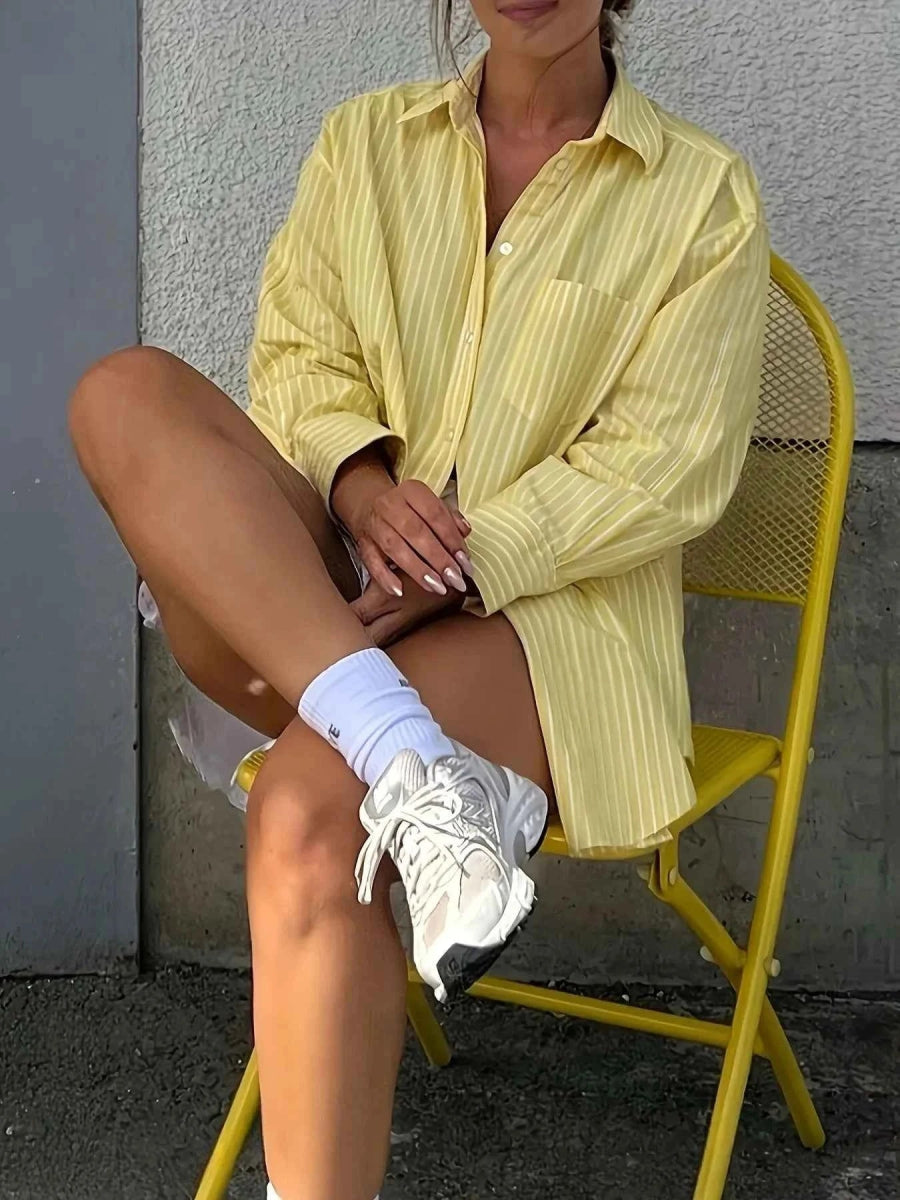Elevate your wardrobe with our striped button-down shirt, designed to seamlessly blend style and comfort. This versatile piece is perfect for both casual outings and office wear, making it a must-have addition to your closet. The classic striped design adds a touch of sophistication while maintaining an easy-going vibe.