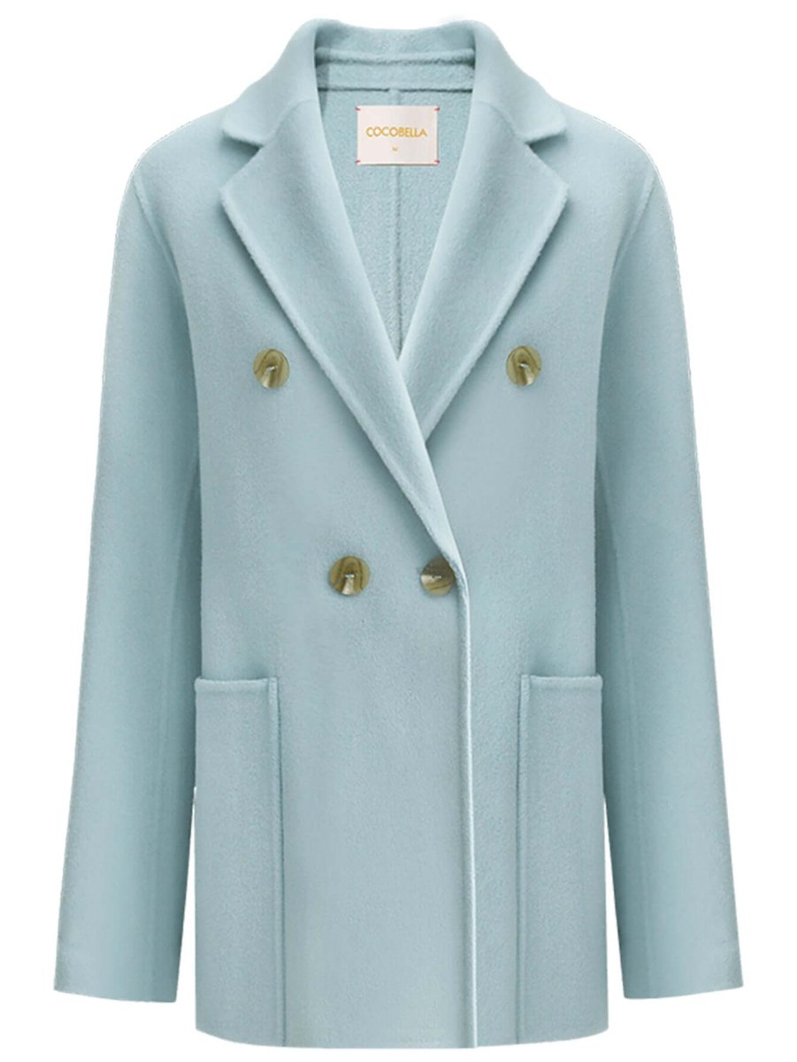 With its elegant lapels and distinctive buttons, the tailored powder blue double-breasted wool coat is not just about looking good; it's also about functionality. The coat features practical pockets for your essentials, combining fashion with everyday usability. Perfect for busy professionals and fashion lovers alike.