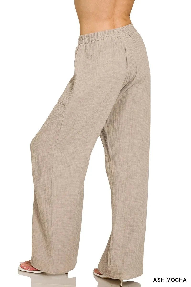 These double gauze elastic band pants are a comfortable and stylish option for a relaxed look. The double gauze fabric...